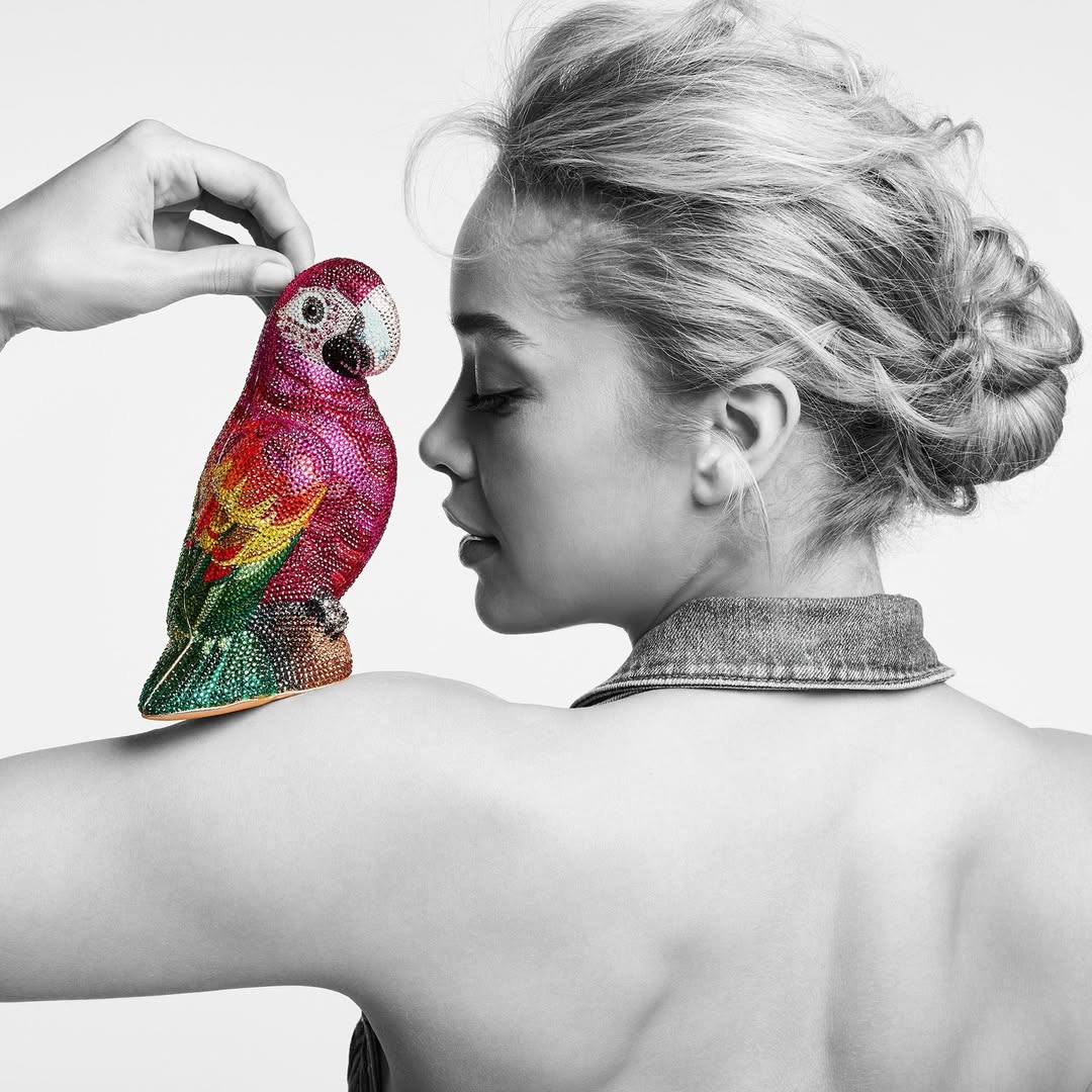 The minaudière (a small, rigid evening bag) became Leiber’s signature. Originally created by Van Cleef & Arpels in the 1930s as elegant metal cases, Leiber reimagined them as fantastical sculptures. She drew inspiration from Chinese ceramics, Art Nouveau, nature, and even everyday objects, creating bags shaped like asparagus, penguins, lipsticks, and champagne bottles. Each piece required months of development and days of painstaking handwork to set thousands of Swarovski crystals.