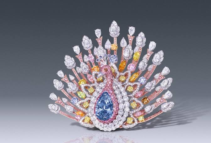 The Graff Peacock Brooch is a creation so audacious–only Graff could dare imagine this masterpiece! Valued at a staggering $100 million, this diamond brooch takes the form of a peacock adorned with 1,305 diamonds. At its heart lies a mesmerizing 20.02-carat blue diamond, surrounded by colored diamonds totaling 120.81 carats.