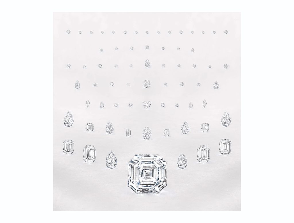 Another Graff masterpiece is the Graff Fascination, showcasing 152.96 carats of white diamonds and a detachable 38.13-carat pear-shaped diamond, that doubles as a ring, embodying the marriage of elegance and engineering.